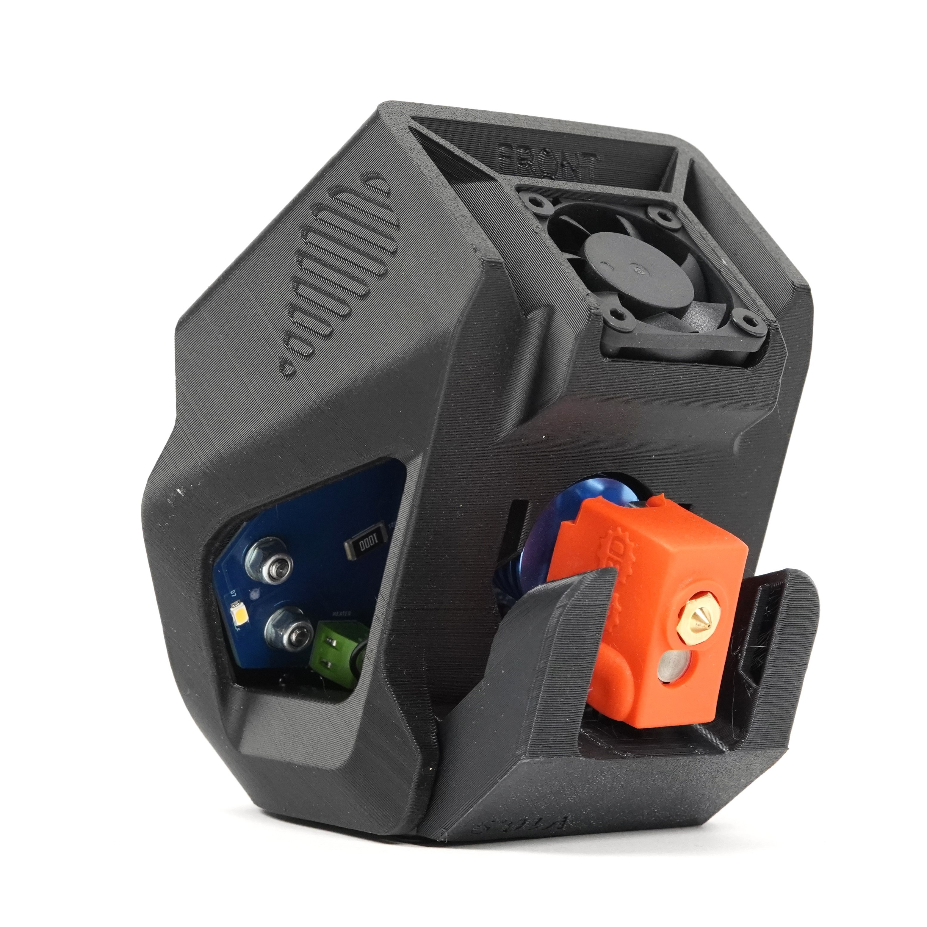 - E3D V6 Volcano hotend, titanium heatbreak, brass nozzle with a diameter of 0.8 mm